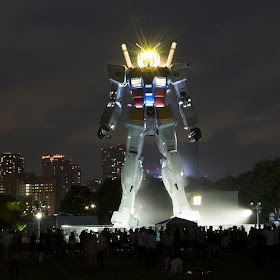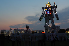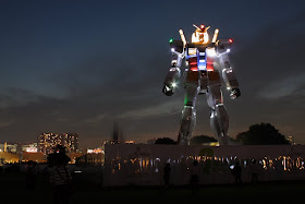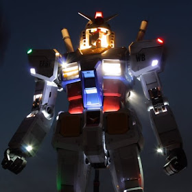 Como no me gusta dejar las cosas a medias y el Gundam grande grande ya está terminado, subo unas imagenes bastante impresionantes del roboto disfrutando de la noche nipona y haciendo alarde de sus majestuosos movimientos de cabeza (arriba, arriba, abajo, abajo, izquierda, derecha, izquierda, derecha... ¿cómo seguía esto?). Amén de sus impresionantes efectos de humo y sus coreografías luminiscentes que seguramente dejarían patidifuso al mejor guerrero del principado de Zeon.